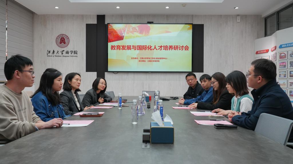 江南大学国际交流合作处副处长秦洁,商学院党委副书记兼副院长孙小芳、学院国际教育顾问陶盈盈、学院海外升学辅导员呼酩杰,以及招生院校代表,参加教育发展与国际化人才培养研讨会。与会嘉宾围绕“如何培育具备国际化视野的人才,助力学生海外名校深造”等议题深入交流,共同探索高等教育国际化的新路径。
