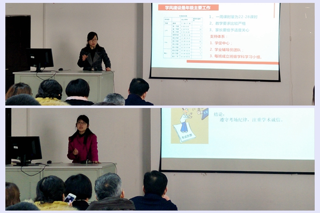 接下来由北美学院学工部主任张慧向家长介绍了近三年来学院学生就业以及读研深造的情况,同时通过十个典型案例分析了学生普遍存在的问题,其中包括由于文化差异与外教沟通问题、学术不诚信问题、宿舍矛盾问题、选课问题、心理健康问题、安全教育问题等。针对这些问题张老师也给出了相应的解决建议,比如尊重外教文化,增强跨文化沟通能力,加强与同学老师之间的交流,增强与人交往的能力,严以律己宽以待人等,为家长和学生们提供了可参考的建议,帮助学生在求学之路上更加顺利。