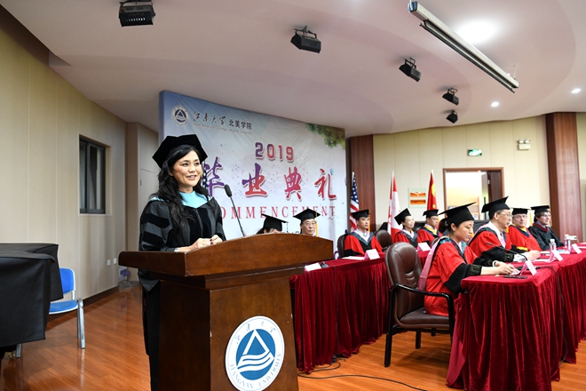美国诺斯伍德大学院长助理、国际教育学院院长Mamiko Reeves博士在随后的致辞中,表示诺斯伍德大学的使命就是“发展未来全球化自由企业社会的领导人”,而2019届的毕业生们也将迈入社会,作出贡献,成为其中优秀的一员。随后,她用5个“C”向大家解释了领导力的含义,分别是,勇气,能力,信念,承诺和性格。在未来,要做正确的事,而不是简单或者流行的事;不断提高自己,而不是找借口;寻求尊重,而不是寻求关注。