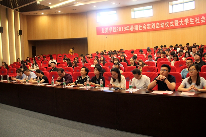 正值中华人民共和国成立70周年之际,为调动全院学生参与暑期社会实践的积极性,勉励大家将理论与实践紧密结合,锻造团队合作意识,明确自身发展目标,培养爱国主义情怀,2019年6月12日下午,江南大学北美学院于远东报告厅开展了2019年暑期社会实践活动启动仪式暨社会实践基地揭牌仪式。国际教育学院与北美学院党委副书记、副院长荆燕等出席,2018级全体学生参加了此次活动。