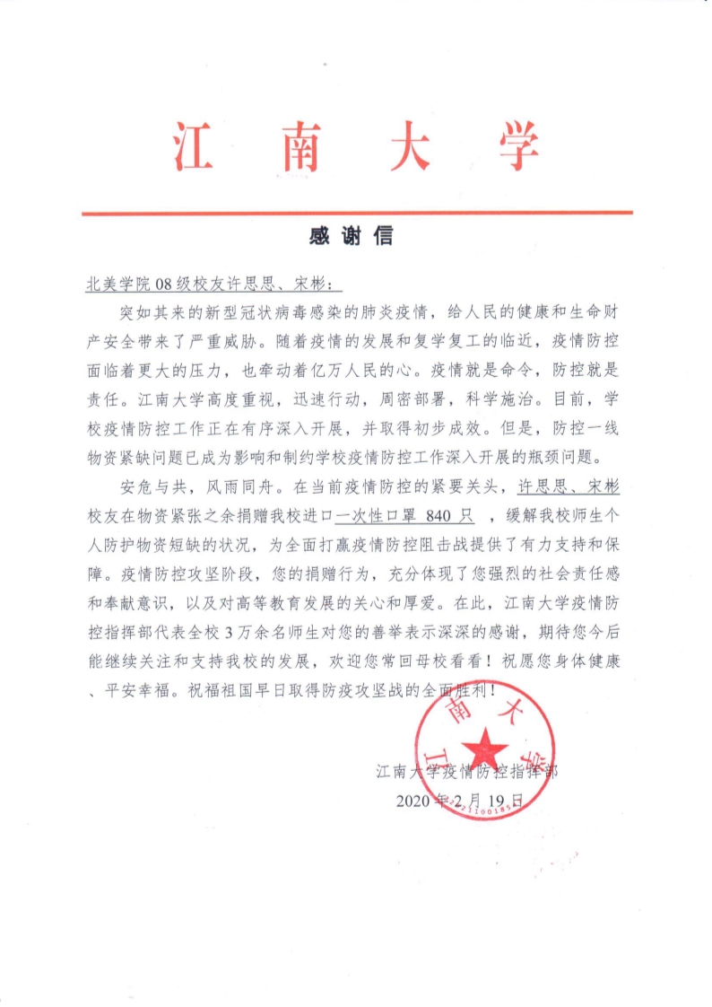 新型冠状病毒肺炎疫情期间,校友许思思、宋彬夫妇时刻心系母校,想母校之所想,急母校之所急,当得知母校防护物资短缺的状况,想方设法从海外采购口罩捐助给母校。校友许思思表示:“我很怀念在学校的生活,母校的培养给予我继续深造以及日后步入社会很大的帮助,作为天下江南人的一分子,很荣幸能为母校尽一些微薄之力”。