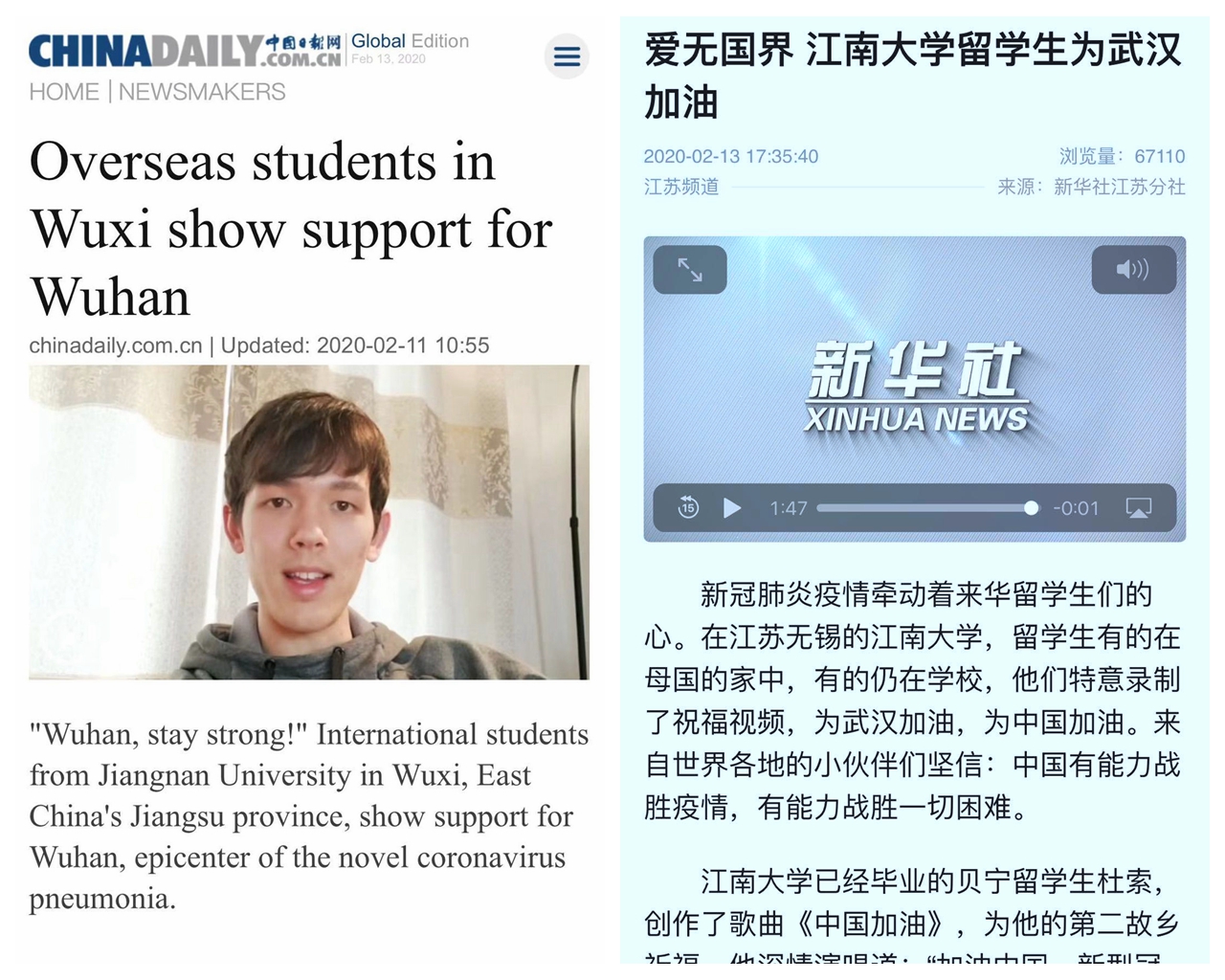 国际学子和校友们的动人事迹,获新华社、中国日报、新华日报、扬子晚报、江苏广电、国家移民管理局微信公众号、江苏省出入境微信公众号等媒体竞相报道,彰显其“知华、友华,爱校、荣校”的情结与精神,体现了我校国际学生群体一片赤诚的中国心,可谓“山川异域,风月同天。你我与共,战疫必胜!”