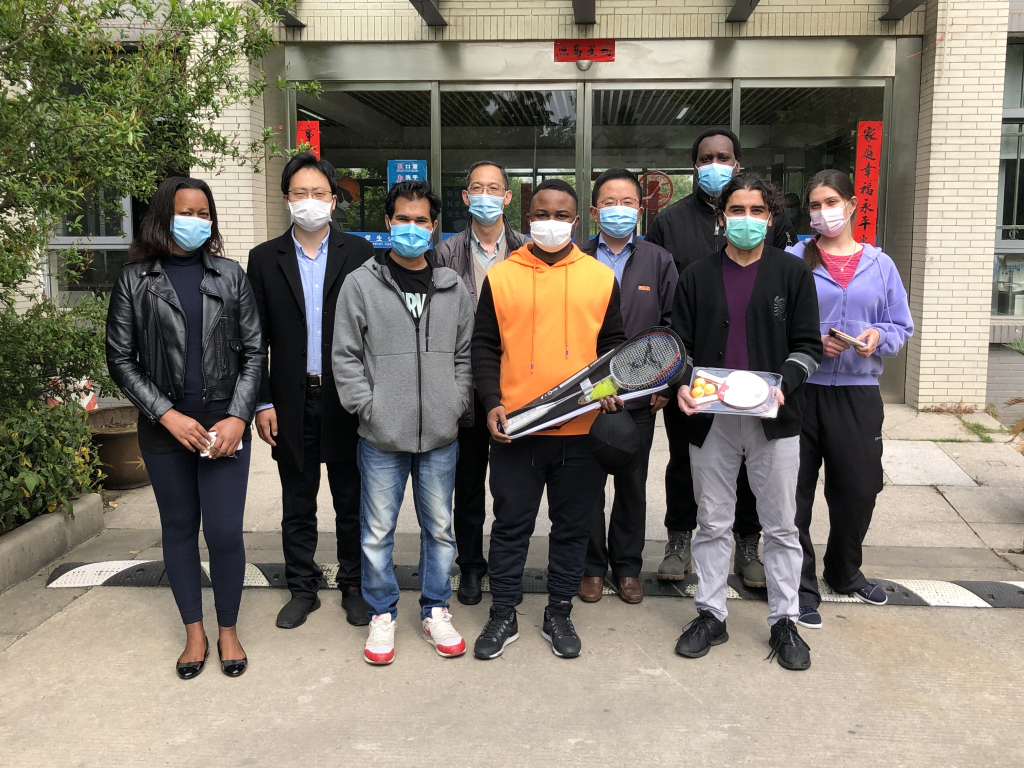 在淳苑公寓,学院领导与来自俄罗斯、加纳、布隆迪、孟加拉国、叙利亚等国家的学生进行了愉快的交流。他们感谢100余名留校国际学生自疫情爆发至今三个多月来所付出的积极努力,以及同学们对学校、学院防疫工作的理解和支持;勉励大家勤奋学习、乐观生活,规划好时间、锻炼好身体。国际学生感谢学校、学院给予的关心和帮助,他们纷纷表示:即便身处异国他乡,也能感受到融融的暖意和充分的安全。交流之后,学院领导还向学生代表赠送了羽毛球拍、跳绳等运动器材,希望大家以良好的身心状态投入新学期。