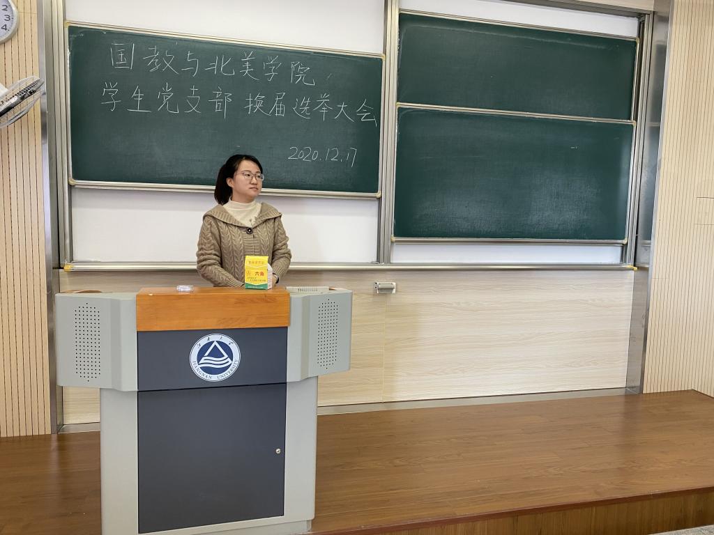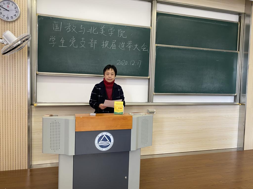 12月17日,国际教育学院与北美学院学生党支部换届选举大会在2A123教室进行。会议由学生党支部书记顾海星老师主持,国教与北美学院党委副书记、副院长荆燕,分团委书记朱琳以及全体学生党支部党员参加了本次会议。