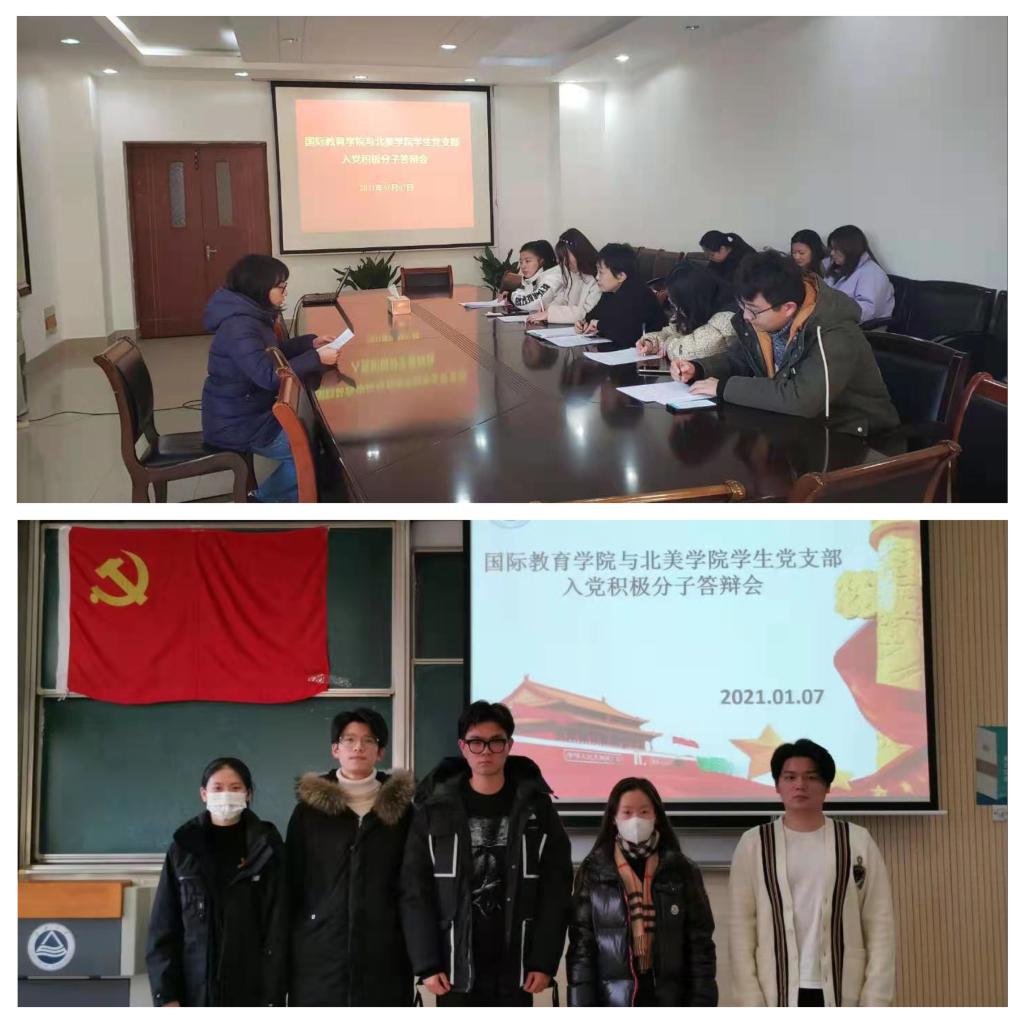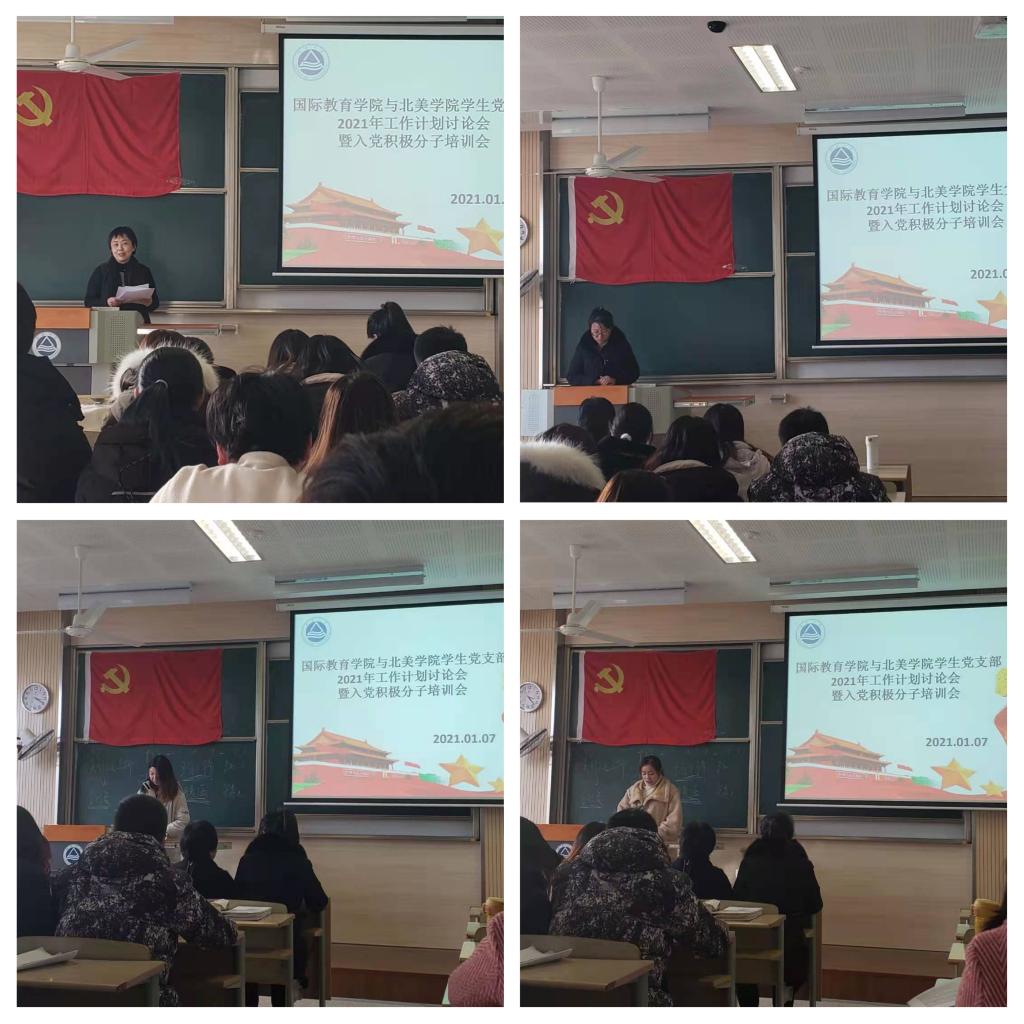 1月7日下午三点,国际教育学院与北美学院学生党支部在二教楼2A123,召开2021年党支部工作计划讨论会暨入党积极分子培训会,除学生党支部25名党员参加会议外,2018级入党积极分子也参加了会议,会议由学生党支部书记顾海星同志主持。