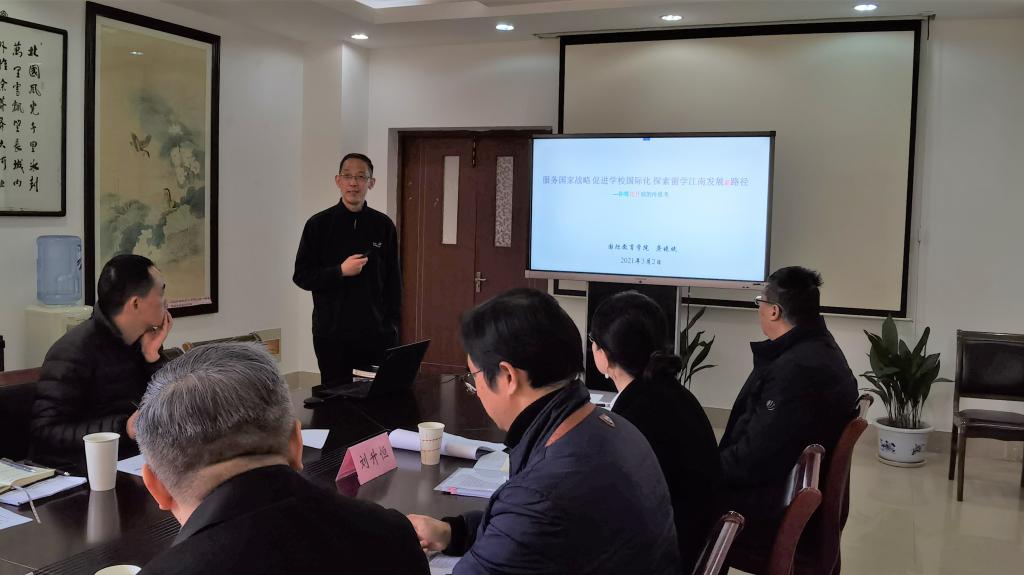 会上,国际教育学院与北美学院院长龚晓斌以《服务国家战略 促进学校国际化 探索留学江南发展新路径》为题汇报了学院目前发展面临的困境和问题,提出了明确任务、提升意识、挖掘资源和拓展空间等思路举措。随后,与会领导就留学生管理和培养的现状、中外合作办学进展和工作计划、国际学生招生与教育中的瓶颈问题等议题进行充分交流。