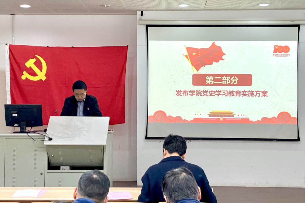会议在建党百年主题MV《少年》的音乐声中拉开序幕。学院党委书记陈琳首先进行动员讲话。陈琳指出,我们要统一思想行动,深刻认识开展党史学习教育的重大意义;把握重点内容,准确领会党史学习教育的目标要求;注重实际效果,有序推动党史学习教育落细落地。他强调,在庆祝中国共产党百年华诞这一重大历史时刻,组织开展党史学习教育,特别是对外开放办学史、留学生教育史,对于我们总结历史经验、认识历史规律、掌握历史主动,对于传承红色基因、牢记初心使命、坚持正确方向,对于深入学习领会习近平新时代中国特色社会主义思想,对于稳步推进建设“具有国际视野、未来思维和江南情怀,在国内具有较强影响力和示范性的国际教育学院”的远景目标,对于在新的历史起点上推进学院、学校“十四五”开局和“双一流”建设,具有重大而深远的意义。