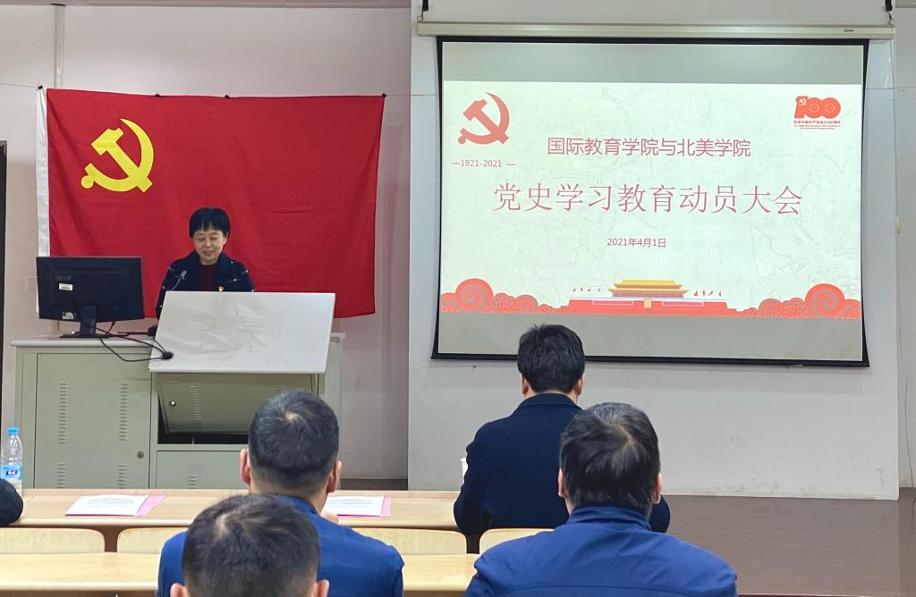 今年是中国共产党成立100周年,党中央决定在全党开展党史学习教育。为全面贯彻落实习近平总书记在党史学习教育动员大会上的重要讲话精神,2021年4月1日下午,国际教育学院与北美学院在学院楼A206会议室召开党史学习教育动员大会,全体师生党员参加会议。学院党委副书记、副院长荆燕主持大会。