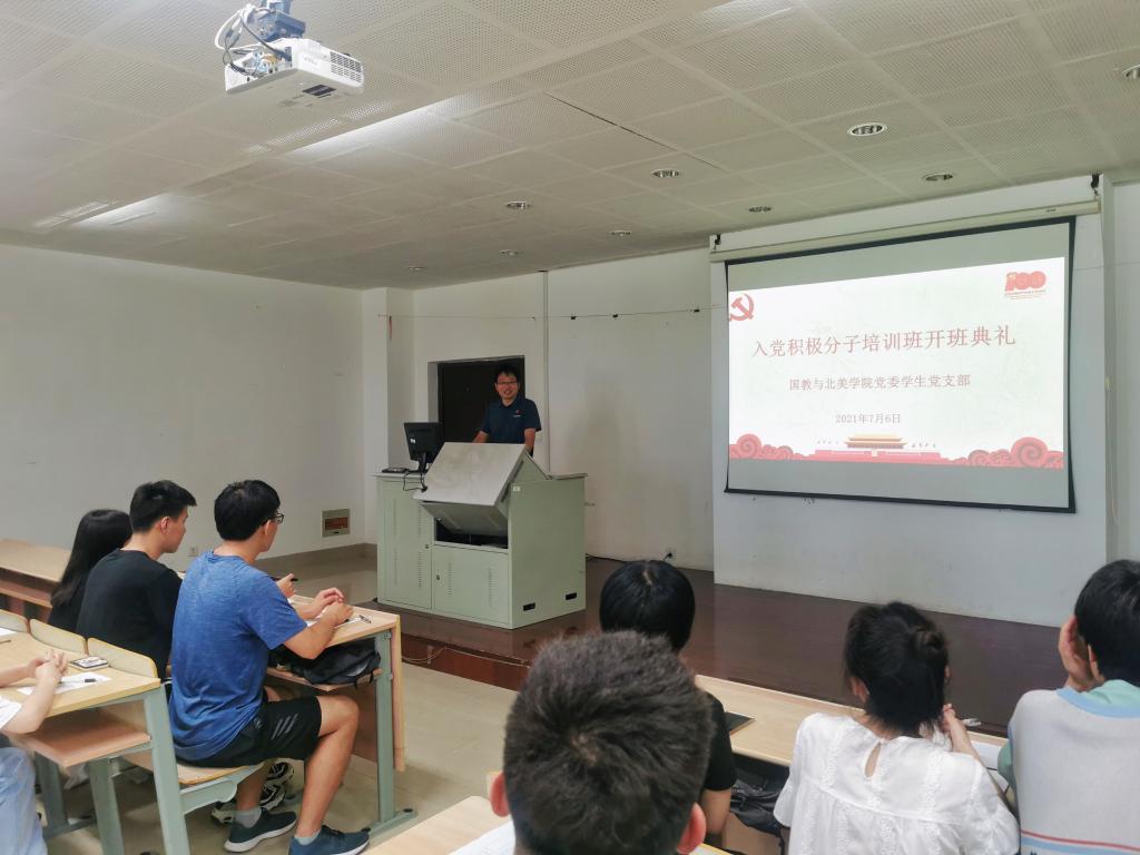 为认真学习习近平新时代中国特色社会主义思想,深入贯彻习近平总书记在庆祝中国共产党成立100周年大会上的重要讲话精神,扎实推进党史学习教育,进一步加强对入党积极分子的培养、教育和考察,提升入党积极分子的理论素养和实践水平,7月6日,国际教育学院与北美学院党委在文科楼A206举办2021年入党积极分子培训班,学院党委副书记荆燕、专职组织员杨艳、学生党支部书记顾海星老师和全体入党积极分子参加了开班仪式。