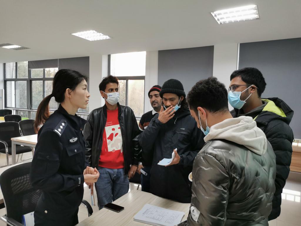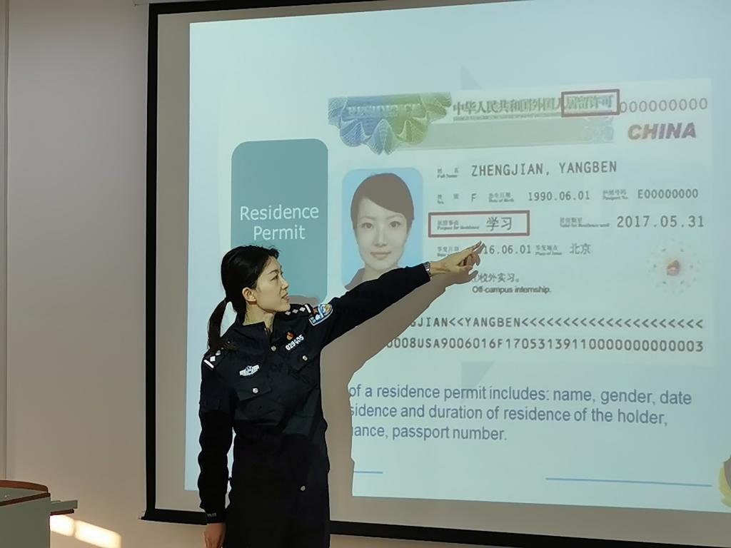 张莉向同学们详细介绍了外国人来华签证、居留许可等相关法律法规,以及公共秩序和社会治安相关案例,提醒大家知法懂法、遵纪守法。警官通过宣讲视频向同学们解读新冠肺炎疫情防控政策,叮嘱大家积极配合疫情防控、加强自我防护意识。在互动问答环节,同学们踊跃发言,就切身相关问题与警官进行交流。李星諓、张莉还向同学们赠送了出入境服务专刊以及中国概况相关书籍。