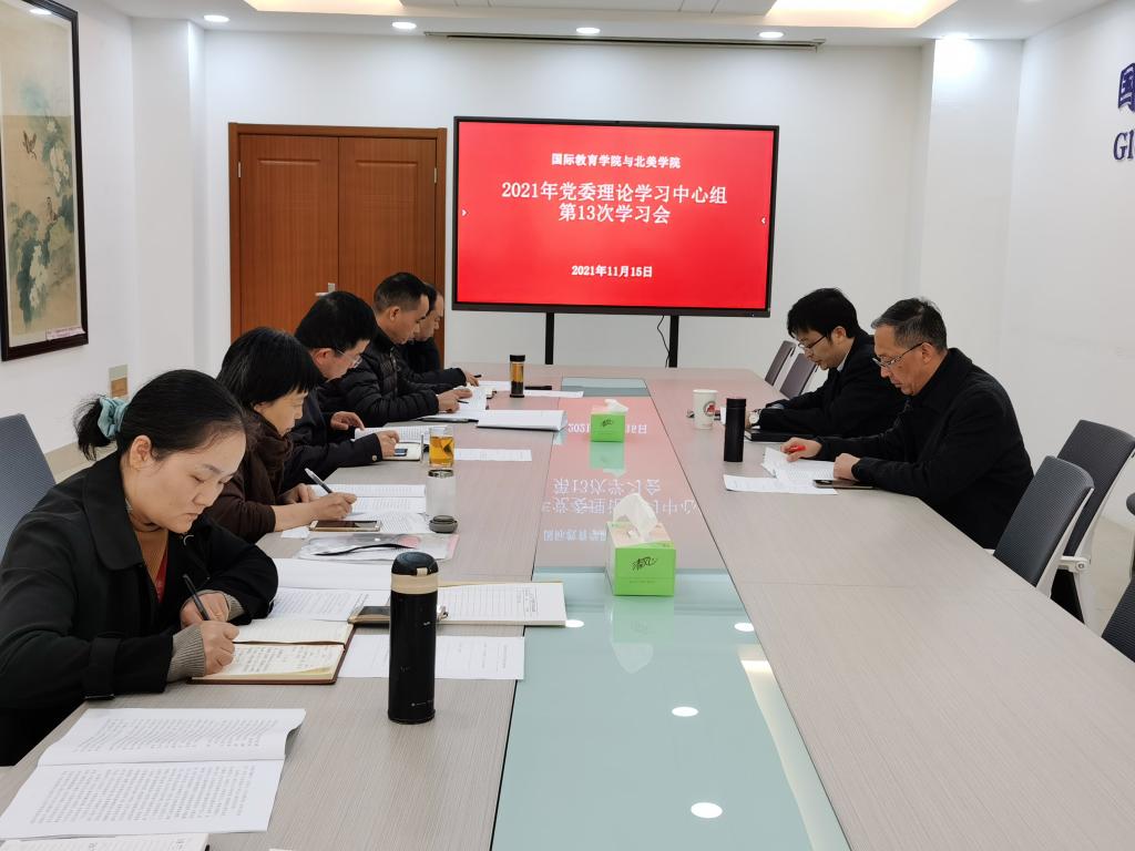 11月15日下午,国际教育学院与北美学院党委在A306会议室召开党委理论学习中心组学习会,专题学习贯彻党的十九届六中全会精神。全体院领导、党委委员参加学习会。会议由党委书记陈琳主持。