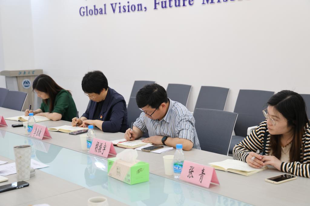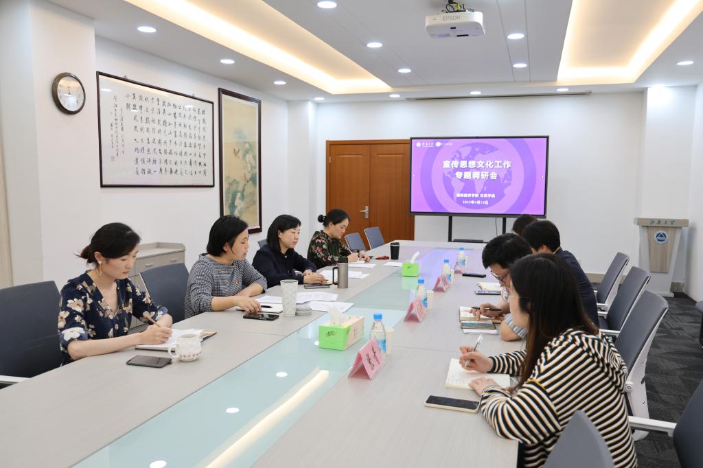 4月18日下午,党委宣传部部长李佳敏、融媒体中心主任兼党委宣传部副部长胡振宇一行4人赴国际教育学院、北美学院开展宣传思想文化工作专项调研。学院党总支书记王晖、副院长王胤、专职组织员杨艳、分团委书记何倩楠参加调研交流。
