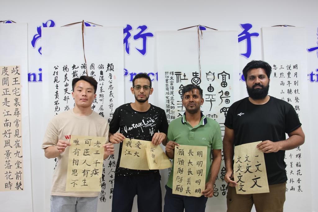 在讲解中,袁琦把精妙深奥的书法知识讲得简单明了、通俗易懂,向国际学生们科普了中国书法的前世今生、书法大家以及他们的传世名作。随后,他耐心示范了基本的握笔姿势以及基本笔画的书写技巧,教学生如何用毛笔写一横一竖、一撇一捺。学生们一人一支毛笔,从学习握笔姿势开始,慢慢掌握了书写的要领,并写出“文明”“我爱江大”“学海无涯”这样的金字金句。