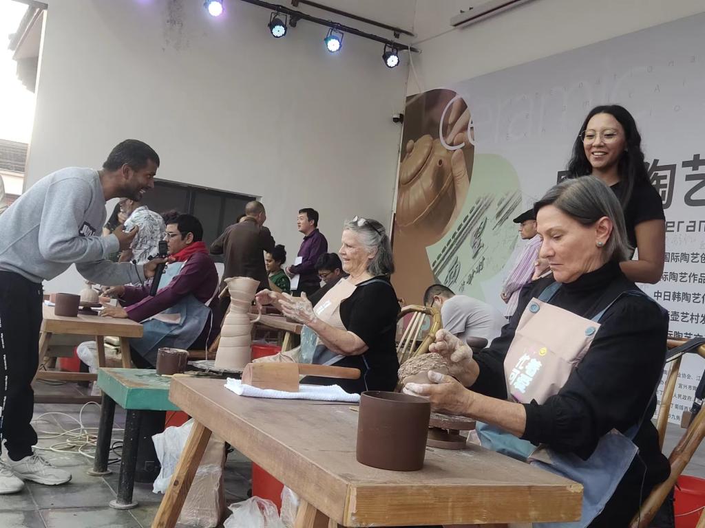 国际学生们来到范家壶庄,认真聆听讲解员的介绍,饶有兴致地了解拉坯、泥条盘筑等基本陶瓷成型技艺,充分感受到了中国陶艺的独特内涵。活动现场特邀来自世界数十个国家的三十余位艺术家集聚,同学们与各国的艺术家交谈沟通,为交流活动增添了更多的国际艺术文化元素。大家还品尝了紫砂茶壶泡的茶,感受了紫砂艺术的古老与现代。