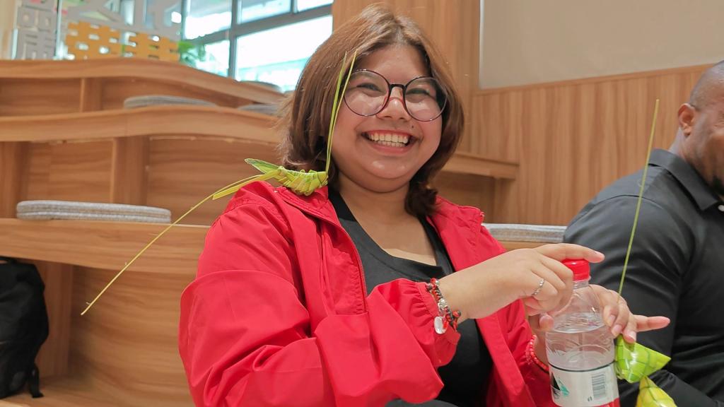 一把剪子、几捆草编绳,裁剪、穿插、固定,步步都是技术活,最考验大家的耐心和细心。在吴小群手把手的指导下,学生们积极尝试参与草编的制作,通过折、叠、拉、扯、剪、插、压等手法,将草丝绕着主体骨架穿插缠绕。随后,他们一步步跟着老师耐心制作出蚂蚱的头尾、躯干以及翅膀等结构,一只只造型逼真的蚂蚱就完成了。大家纷纷拿着自己的作品和老师合影留念,欢喜之情溢于言表。