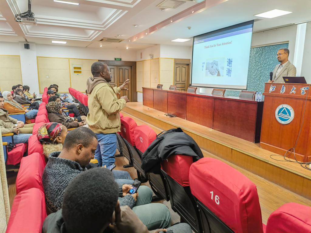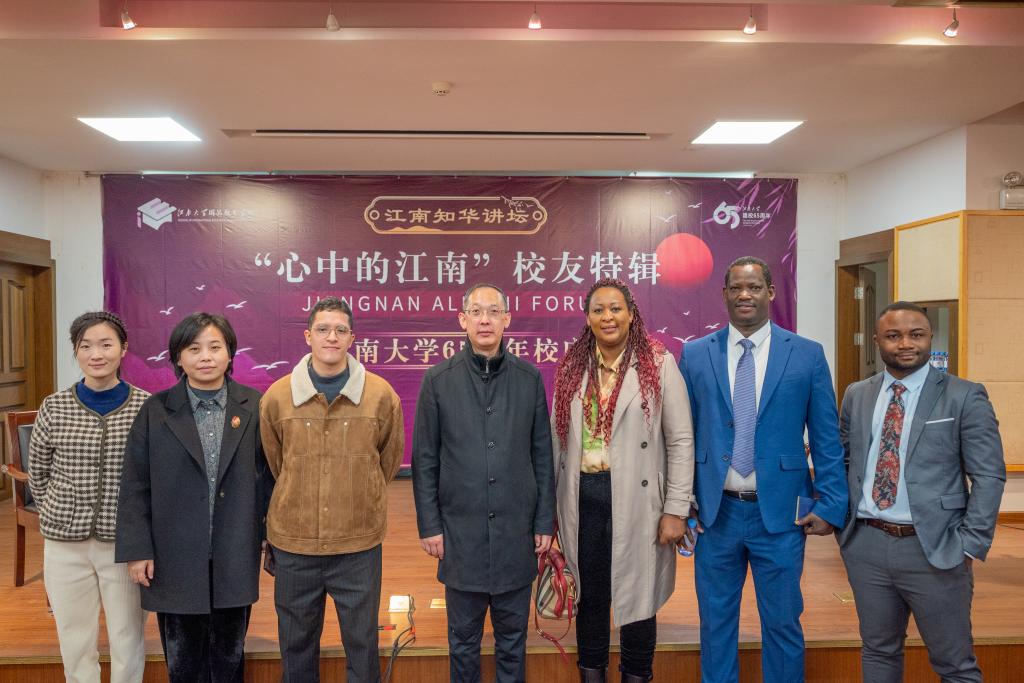 知华讲坛,畅谈江南。值此建校65周年之际,“江南知华讲坛”举办了“心中的江南”校友特辑活动。院长龚晓斌对返校校友表示欢迎,并与他们亲切交流。四名留学生校友代表参加“江南知华讲坛”,与在校国际学生畅谈江南。校友戈壁回顾了在江南大学的求学时光以及与老师和同学们的深厚友谊。多年在中国的学习生活让他与中国结下了不解之缘。阿尔法和大家分享了自己的求学和科研之路。对中国的向往和对中华文化的喜爱让他在众多的留学offer中毫不犹豫的选择来到中国。在中国他遇到了良师益友,一起在科研之路上努力向前。作为就业校友和创业校友的代表,卡洛斯和何爱兵与大家分享了自己求职经历和工作经验,并为有意就业的同学们提出了宝贵建议。