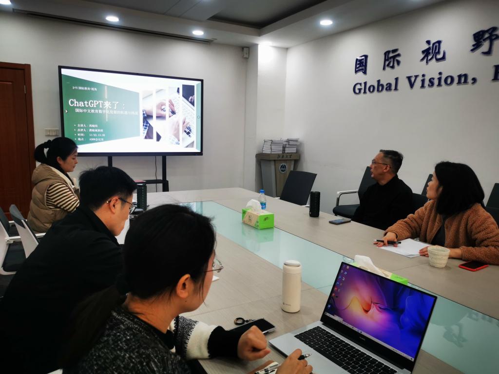 11月23日下午,江南大学国际教育学院系列教研活动“2·11国际教育·视角”第八讲在国际教育学院A306会议室举行。国际教育学院院长龚晓斌与国际中文教育中心全体教师参会。本次活动以“ChatGPT来了——国际中文教育数字化发展的机遇与挑战”为主题,由国际中文教育中心教师芮晓玮主讲。
