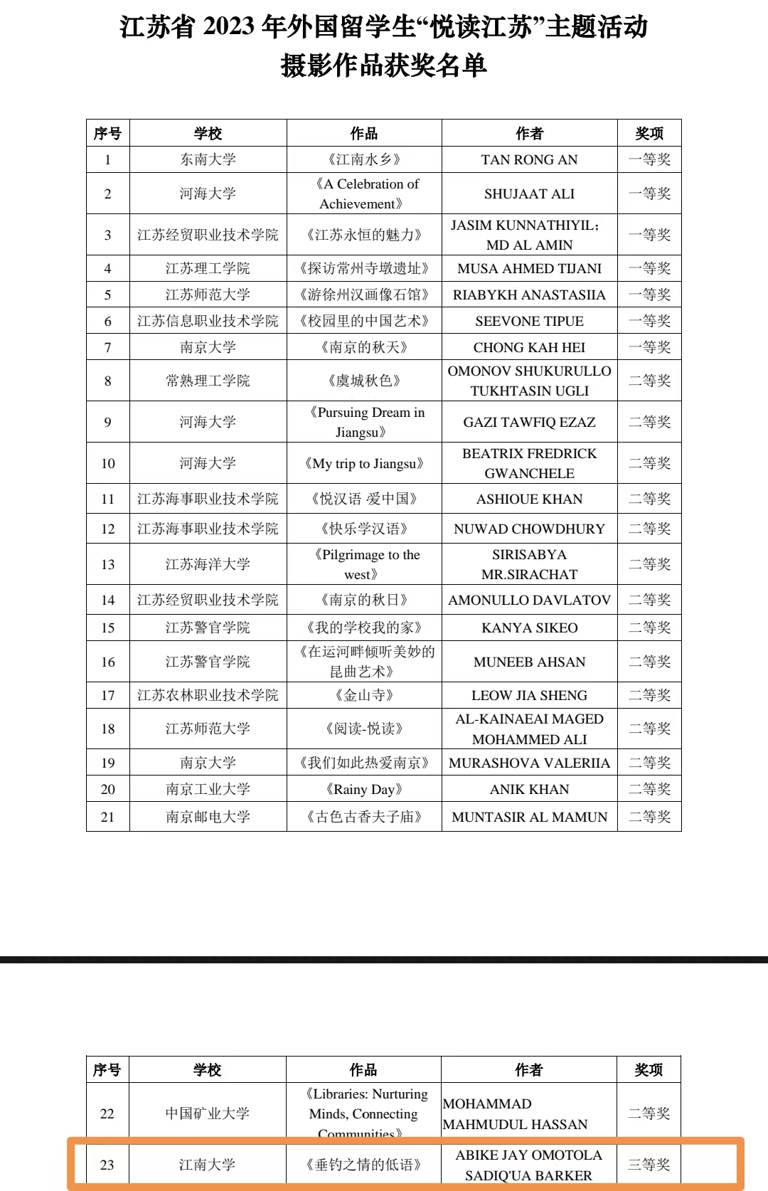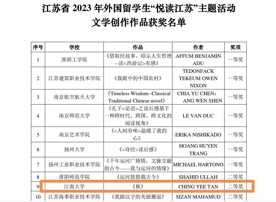 近日,由江苏省教育厅组织的2023年江苏省“悦读江苏”主题活动公布了评审结果,我校共有2名同学获奖。马来西亚籍CHING YEE TAN(中文名:陈晴怡)同学的文学创作作品《秋》获得二等奖,圭亚那籍ABIKE JAY OMOTOLA SADIQ'UA BARKER(中文名:林旭)同学的摄影作品《垂钓之情的低语》获得三等奖,获奖作品充分展现了国际学生对中国语言文字和中华文化的了解和喜爱,展现了他们的卓越才华和青春面貌。