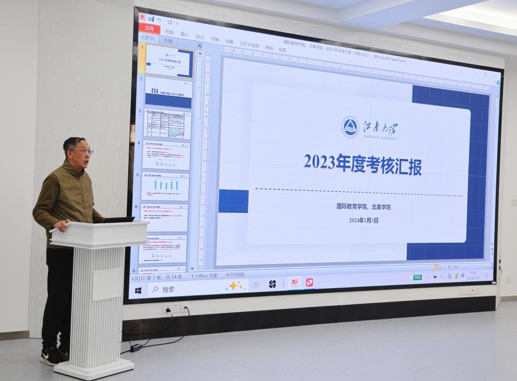 首先,院长龚晓斌作学院2023年工作报告。他从任期目标完成情况、显著业绩与突出成果、重要工作推进情况三个方面总结梳理了学院第八轮任期目标年度完成情况并对新一年工作进行展望。他提出,要以积极服务国家“一带一路”战略和学校“奋进计划”为目标,从谋篇布局到精耕细作,从规定动作到创新突破,守土有责,守土尽责,讲好中国故事、传播中国经验、发出中国声音。