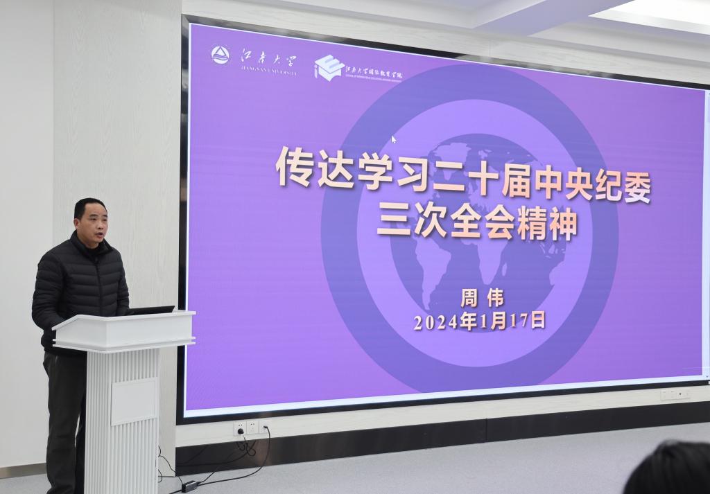 接着,副院长、纪检委员周伟作题为《传达学习二十届中央纪委三次全会精神》的教职工政治理论学习专题讲座。他从全面从严治党的新进展新成效、党的自我革命的重要思想、纵深推进发腐败斗争的战略部署、对纪检监察机关作出要求等方面为切入点,带领教师们深入学习领会习近平总书记重要讲话精神并传达学习二十届中央纪委三次全会公报内容。随后,组织员沈丹就假期实验室安全、教职工安全防范、办公室值班安排、教职工假期出国出境备案等内容做工作提醒。
