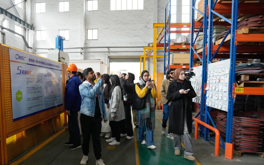 首先,国际学生们来到无锡欧瑞京机电有限公司,在讲解员的介绍和带领下参观工厂,了解公司的业务范围和海外市场情况,学生们还就感兴趣的话题与公司负责人深入交流。随后,国际教育学院与惠山区专门组织了国际学生与区内出海企业交流座谈会,国际教育学院党总支副书记王胤介绍了江南大学国际学生培养情况,四家代表性出海企业代表分别介绍了企业“走出去”情况、海外人才需求和招聘难点。交流环节,同学们也踊跃发言,双方就精准对接、供需匹配、海外就业流程等具体问题展开讨论。