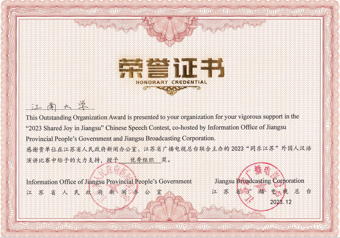 近日,在由江苏省人民政府新闻办公室、江苏省广播电视总台联合主办的2023“同乐江苏”外国人汉语演讲比赛中,江南大学推荐参赛的七名国际学生全部获奖,其中来自埃及的刘天乐以总分第一名获得一等奖,是我校参赛以来的最好成绩。同时,因组织出色、成绩优异,我校获评大赛优秀组织奖。