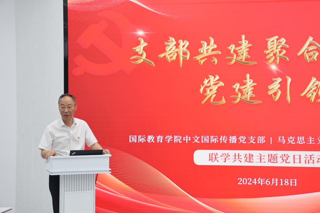 为推动党纪学习教育走深走实,促进教工党支部互联互动、共建共赢,6月18日上午,国际教育学院中文国际传播党支部与马克思主义学院教工第二党支部开展以“支部共建聚合力、党建引领促发展”为主题的联学共建主题党日活动。校党委常委、统战部部长、工会主席朱飞,国际教育学院党总支书记王晖、马克思主义学院党委书记李凤梅以及两个支部的30余名支部成员出席了本次活动。活动由中文国际传播党支部书记王利峰主持。