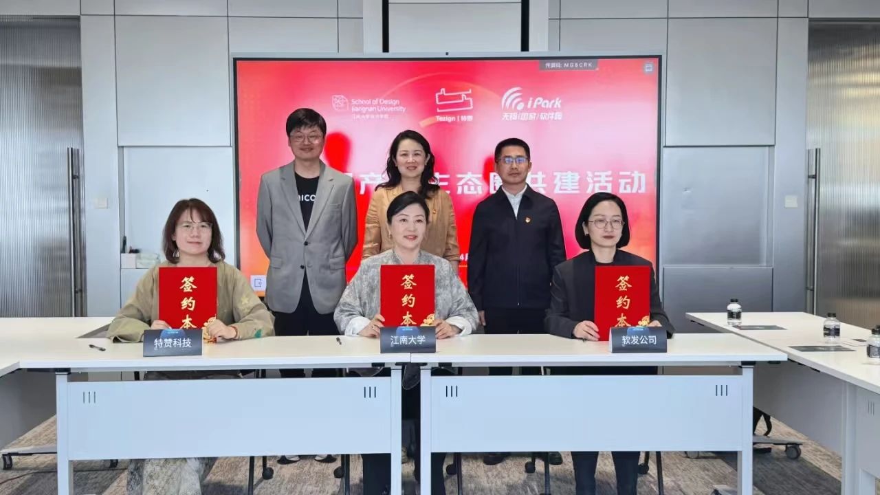 近日,为深入贯彻落实党的二十届三中全会精神,推动党建工作与事业发展深度融合,江南大学设计学院视觉与信息设计系党支部、特赞(上海)信息科技有限公司、无锡软件产业发展有限公司(以下简称“无锡软发”)党支部联合举行《校企园三方共建协议》签约仪式,并围绕协议内容开展“校企园产融生态圈”共建活动。设计学院视觉与信息设计系党支部书记吴祐昕教授,特赞首席组织官、CEO助理王雨婷,无锡软发党委副书记、纪委书记尤鹃红代表三方签约。设计学院党委副书记、副院长江琳娜,特赞CEO范凌,无锡软发党委副书记、总经理严卫中见证签约,标志着三方在党建引领下的产学研合作迈入新阶段。