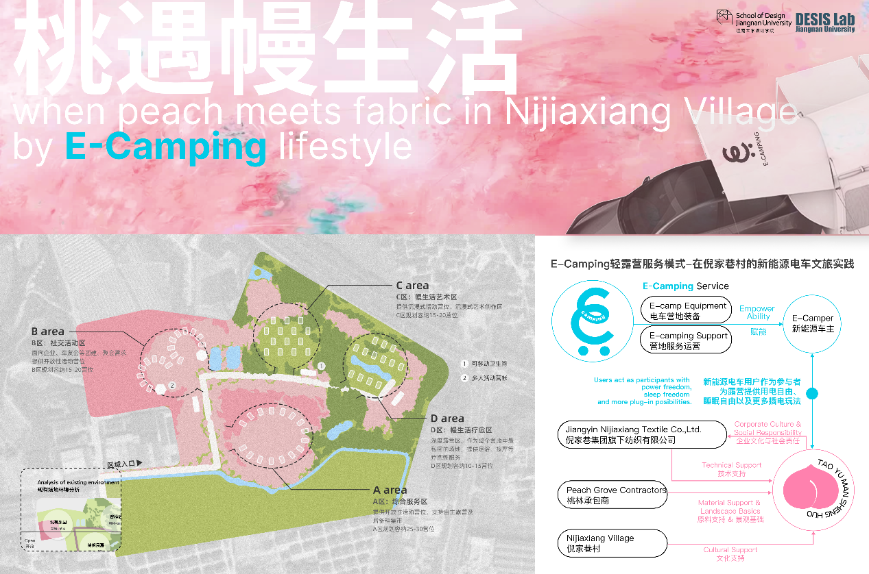 《E-Camping in Nijiaxiang》以新能源汽车为载体,围绕 “Electric(带电露营)、Eco - friendly(亲自然)、Easy(低门槛轻松露营)” 设计理念,整合倪家巷村的地理资源、文化景观与人力资源,构建了 “新能源汽车赋能乡村文旅” 的创新服务系统。设计团队充分利用新能源汽车内部空间舒适、可变性强以及电力外放的特性,将游客的新能源汽车重构为“天然的”可移动空间单元,大幅减少基建成本,将重心聚焦于乡村风景与文化体验层面,设计了特色植物疗愈等活动体验,推动乡村文化从 “静态展示” 转向 “活态传承”的文化共生式转型。