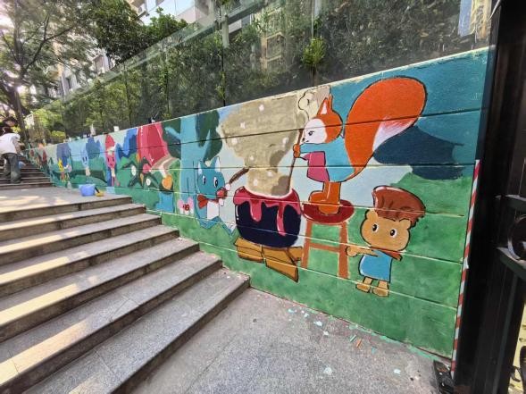近日,设计学院“手指上的中国”团队把“以美育人、以美化人、以美培元”的理念带到了北大街社区,开启了一场有趣的墙绘之旅,用画笔为社区换上了一件美丽的“新衣”。