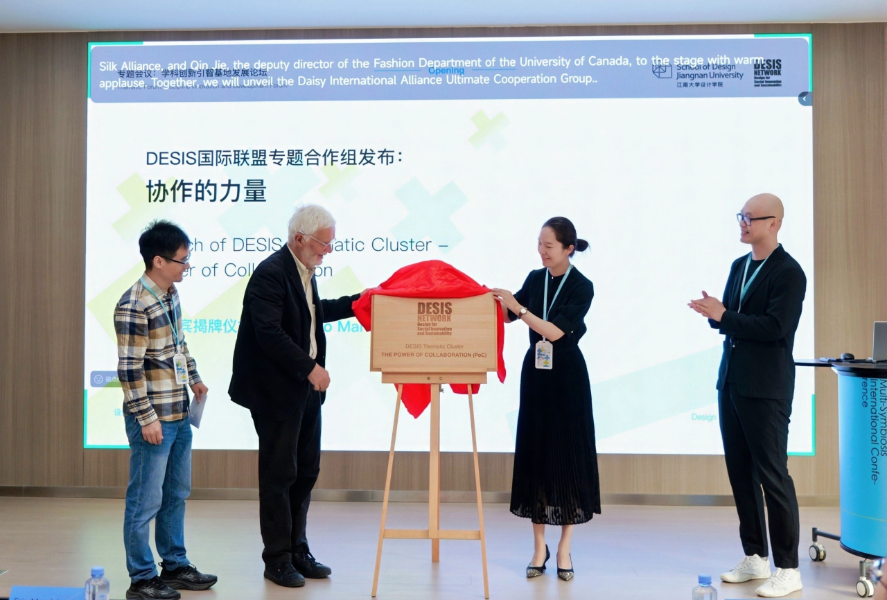开幕式上还举行了国际社会创新与可持续设计联盟(DESIS)框架下专题合作组“协作的力量(PoC)”的启动仪式。DESIS联盟执委、江南大学设计学院巩淼森副教授对项目作了介绍,秦洁与DESIS联盟发起人兼主席Ezio Manzini教授共同为合作组揭牌。