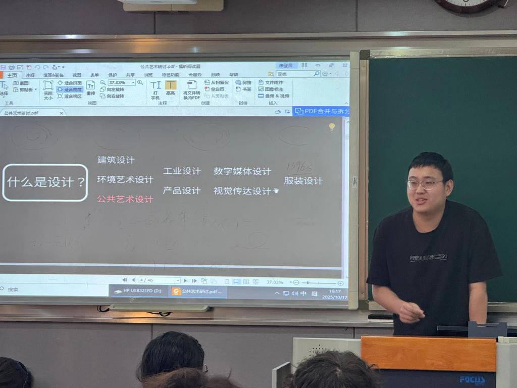 活动伊始,系主任赵昆伦老师以宏阔的视野,为同学们深入阐释了公共艺术的深刻内涵。他以专业发展的“四阶段论” 为脉络,生动描绘了设计从教室走向校园、融入城市、服务国家乃至对话世界的壮阔图景。赵老师的讲解,帮助新生们搭建起一个系统的专业认知框架,让大家深刻理解到公共艺术在不同时空尺度下的社会价值与多元表现形态,为后续的专业学习奠定了坚实的理论基础。