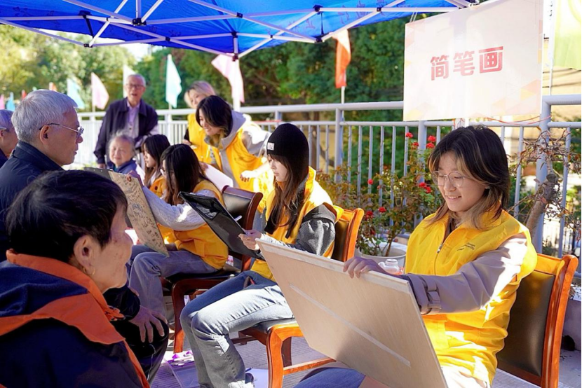 不同风格的画作都戳中了老同志们的心。当他们接过肖像画时,先是低头细细端详,接着互相传阅,嘴角藏不住笑意:“太传神了!这就是我现在的样子,比照片还有意思!”“这漫画把我画得真精神,还有点像我年轻的模样!”温暖的阳光洒下来,落在老同志们的白发上、同学们的黄色马甲上,也落在一张张鲜活的肖像画上,暖意融融。