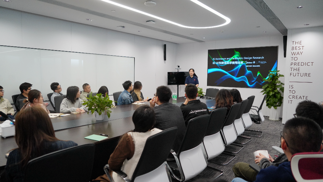 美的集团家用事业部设计负责人详细介绍了企业在家电出海设计需求、海外用户体验设计以及可持续设计领域的最新实践。周敏宁教授就“未来智慧家居生态设计”与“AI辅助设计及参数化设计技术流程”向美的设计部全体设计师做汇报演讲,并就校企联合创新工作室、学生实训基地共建等事项进行进程汇报。
