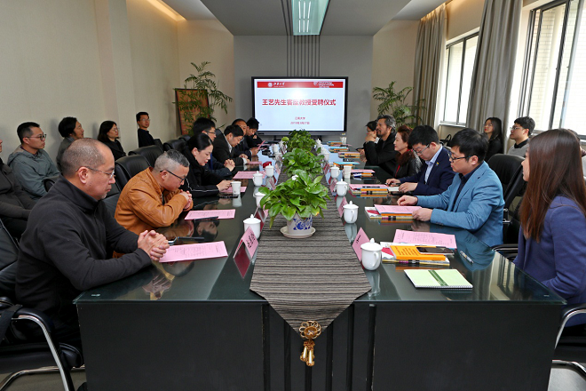 邱建平主持聘任仪式,张凌浩介绍了王艺教授的主要成就,对王教授在美术学领域取得的卓越成绩表示赞赏。陈坚向王艺教授授予了江南大学客座教授聘书,并为他佩戴江南大学校徽。王艺教授表示能成为江南大学的一员感到荣幸,在以后的工作中会致力于支持设计及美术学专业创作实力提升,提升学科影响力和学院的美誉度。赵燕也表示今后公司在产品设计方面将和学院进行合作,推动产学研深度融合,实现校企的深层合作与共赢发展。