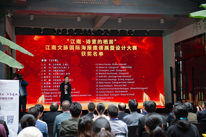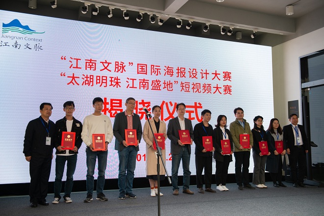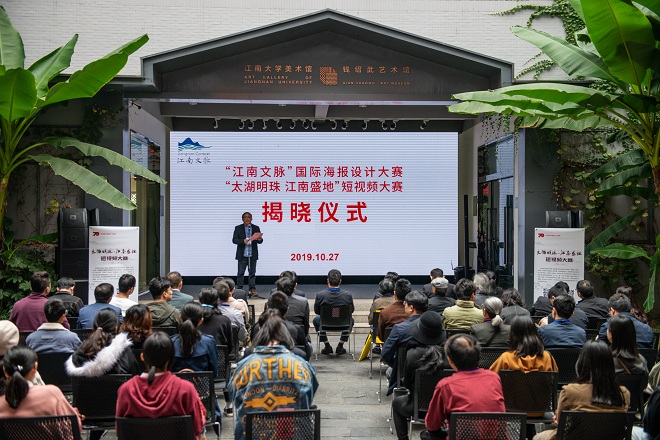2019年10月27日,江南文脉国际海报设计大赛暨“太湖明珠 江南盛地”短视频大赛揭晓仪式在钱绍武艺术馆举行。无锡市委常委、宣传部长袁飞,副校长顾正彪,市委宣传部副部长、网信办主任蔡文煜,市委网信办副主任娄子丹,社会科学处处长刘焕明,设计学院院长魏洁,两个大赛的获奖代表,设计学院老前辈寻胜兰教授、陈新华教授、孔德扬教授及设计学院视觉传达系教师代表等出席了仪式。揭晓仪式由设计学院党委书记邱建平主持。