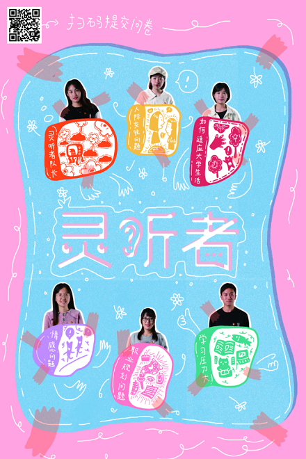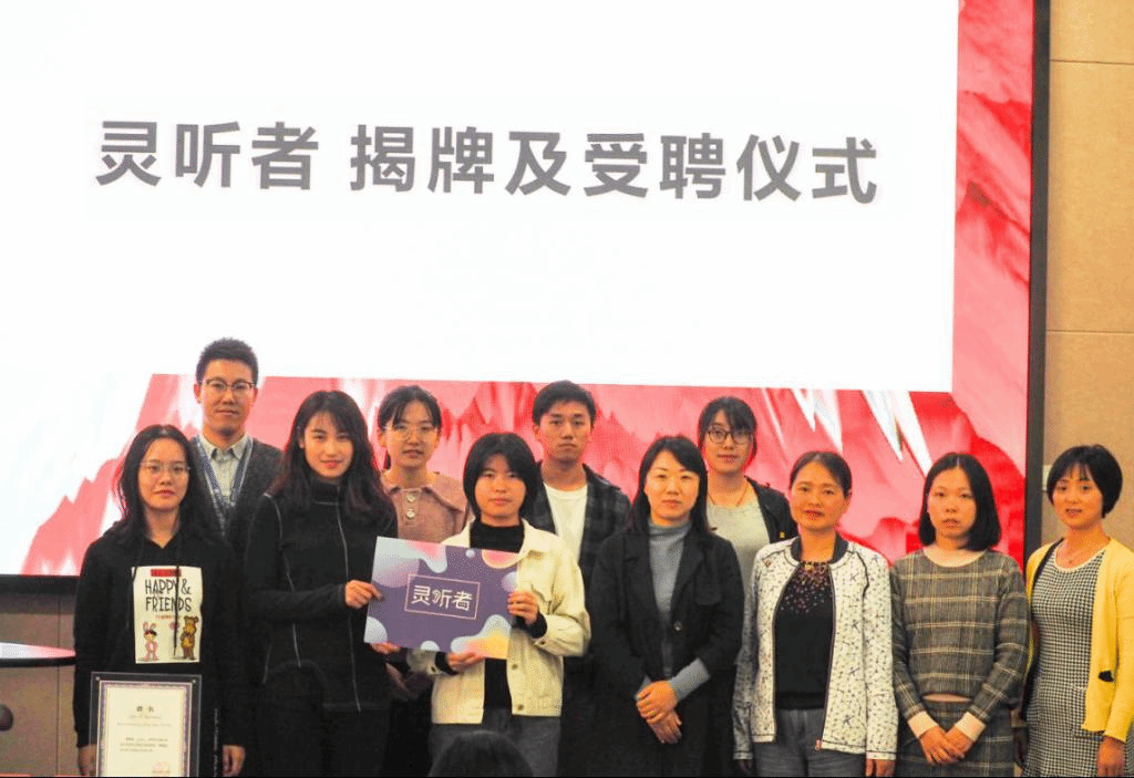 接着,灵听者团队主成员饶锎月、刘琳、张佳佳、刘欢欢、杨雪晴为灵听者团队揭牌,灵听者团队主标由本科联合党支部肖奕云同学设计,灵动的图案意指我们陪你看听世界,倾听你的内心世界。