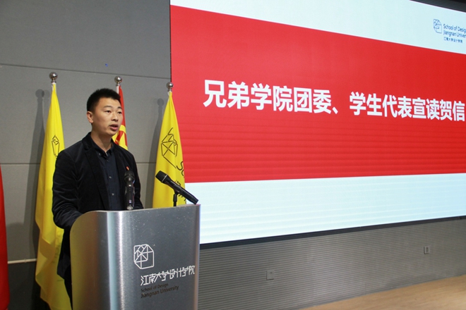 商学院分团委书记林增代表兄弟学院团委致贺辞,他高度评价设计学院在团学工作中所取得的成绩,期望继续深化两院共青团间的交流与合作。物联网工程学院学生会主席袁静怡作为兄弟学院代表宣读贺信,表达了对两院继续友好协作、共同进步的美好祝愿。