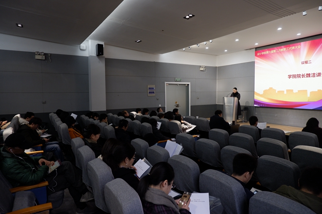 大会在庄严的国歌声中开始。学院魏洁院长首先代表学院对本次会议的召开表示祝贺!她表示学院教职工代表大会作为学院科学管理体系中的一个重要组成部分,肩负着贯彻党的路线方针政策,维护教职工合法权益,组织教职工参与学院民主管理和民主监督,团结教职工积极投身学院建设的重要任务。同时,她肯定了学院分工会在做好学院党政助手,关心学院教职工需求,营造学院特色文化等方面做出了很好的成绩。同时,她希望在学院发展的新时期,学院分工会和全体代表进一步发挥组织群众、宣传群众、引导群众的工作,多做统一思想、凝聚人心、化解矛盾、增进感情、激发动力的工作!