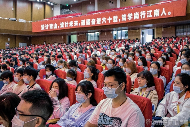 典礼仪式结束后,邱建平为全体新生讲授思政第一课。他围绕“深入学习十九大精神”、“战疫给我们的思考”和“设计青山,设计未来”这三个方面进行阐述。首先具体介绍了党的十九大会议主题相关内容及其精神内涵,并带领大家学习了习近平新时代中国特色社会主义思想的形成以及历史贡献;其后,结合战“疫”数据及其成果向同学们展示了中国精神、中国力量以及中国担当,充分体现了中国共产党的领导力,反映出了中国特色社会主义制度的显著优势。最后,围绕“我是谁”“我骄傲”“我设计”三个维度展开,他希望同学认真思考,紧密跟随“坚持中国特色社会主义教育发展道路,培养德智体美劳全面发展的社会主义建设者和接班人”的成才方向,做有理想、有担当的一代青年。他以4P方法即规划(plan)、实践(practice)、慧玩(play)、坚持(persist)和3D方法即梦想(dream)、坚持(duration)、卓越(distinction)的讲述提出了对同学们的要求,希望同学在设计学院成立60周年之际,能够传承青山精神,谋大格局、唱高格调,当先锋设计者,引领者。