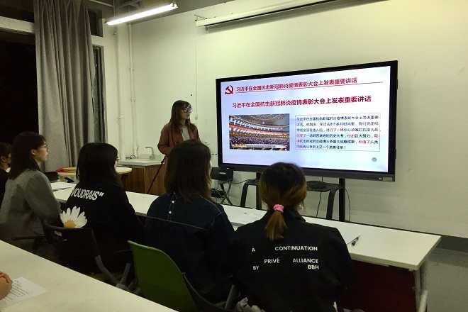 为弘扬伟大抗疫精神,强化青年党员的使命和担当,10月14日下午,设计学院本科服装党支部举行主题党日活动,专题学习习近平总书记在全国抗击新冠肺炎疫情表彰大会上的重要讲话。活动由党支部书记于乐主持,全体党员参加学习。