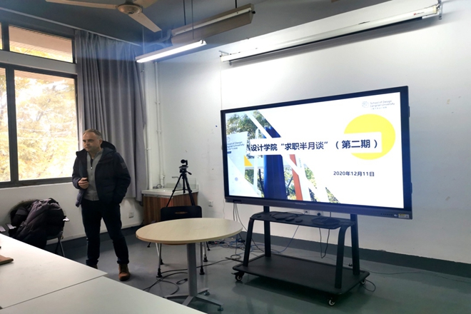 12月11日下午,设计学院创新就业指导类活动“求职半月谈”第二期在设计学院A207举行,此次活动邀请了比亚迪集团全球内饰设计总监MICHELE DOMENICO JAUCH,外饰设计经理上官长树,HR总监吴晓莹总监与同学们共同交流,活动由设计学院就业工作分管辅导员马倩如主持。