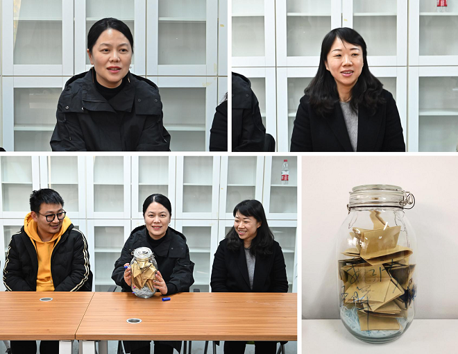 活动中,魏洁、王晖、蒋乾灵三位老师为视觉传达专业同学赠送了设计学院建院60周年纪念书籍《设计教育的实践与探索》,希望同学们传承青山精神,承担设计使命。随后,同学们书写了对大学的规划与愿景,将“梦想”投递到心愿瓶中,与三位老师共同签字封存。