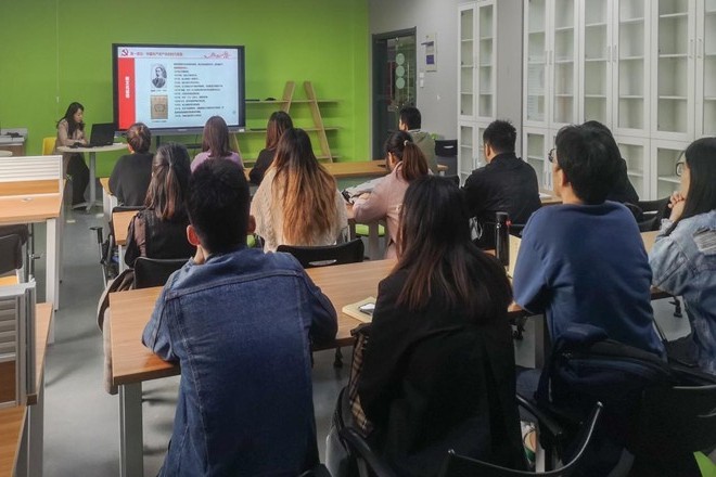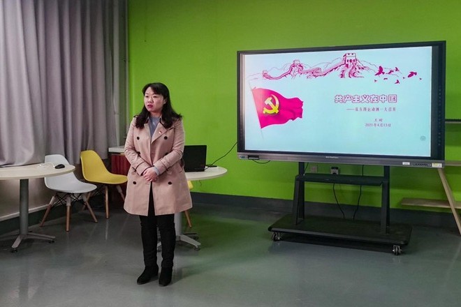 王晖以“共产主义在中国-从五四运动到一大召开”为题为创业党支部和交互党支部全体师生党员讲授党课。她从习近平总书记在纪念五四运动100周年大会上的重要讲话切入,从中国共产党产生的时代背景、中国共产党的诞生早期的艰辛历程、中共一大代表的人生浮沉、对当代学生党员成长的启示四个方面进行讲解,围绕中国共产党成立过程中的关键人物的革命经历为脉络,介绍了中国先进分子从五四运动以全民族的行动激发了追求真理、追求进步的伟大觉醒,到集合在马克思主义旗帜下成立中国共产党的伟大历程。她指出,五四新文化运动是中国人的“伟大觉醒”,中国共产党成立是中国革命新的伟大开端。