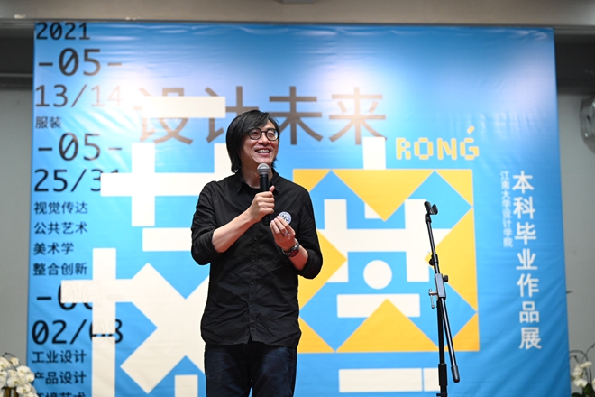 最后,邱建平表达了对毕业生的殷切期望与未来祝福,并宣布“设计未来·融——江南大学设计学院2021届本科毕业设计作品展”(第二场)开幕。