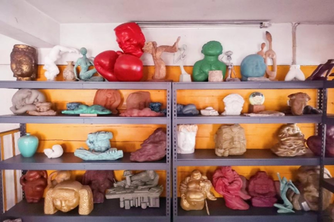 活动伊始,朱静带领全体成员前往徐诚一教授位于东门的“阿炳雕塑馆”。走进工作室内,充满着古朴质感和现代韵味的艺术气息扑面而来,室内陈列了徐诚一近期创作的部分丰厚杰作,其中大多都是以阿炳为主题,题材相同,但形式各样,栩栩如生,又精妙绝伦,可谓“自云有奇术,探妙知天工”。每一处凹凸,雕刻的是艺术;每一笔润色,修饰的是精神,这便是徐诚一对阿炳形象流露出的真实情感。从这些雕塑作品中,同学们切身感受到了徐诚一真诚理性的创作精神和对艺术的追求与热爱,也无不为这些巧夺天工的深刻塑造,独具匠心的艺术形态所震撼。
