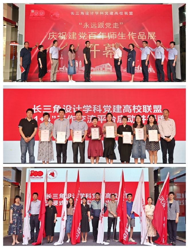 6月11日上午,长三角设计学科党建高校联盟“永远跟党走——庆祝建党100周年师生作品展”开幕式在江南大学美术馆暨钱绍武艺术馆举行。校党委副书记戴月波,校党委常委张影陆、倪松涛、朱飞,纪委副书记、纪委办公室主任兼监察处处长李佳敏,学生工作部部长张菁燕,党委教师工作部副部长陈炜昀,设计学院首任院长张福昌,长三角设计学科党建高校联盟各单位党委书记、党委副书记、专职组织员、分团委书记、教工党支部书记代表以及设计学院全体党委委员、教工党支部书记、师生代表等100人出席活动。活动由设计学院党委书记邱建平主持。