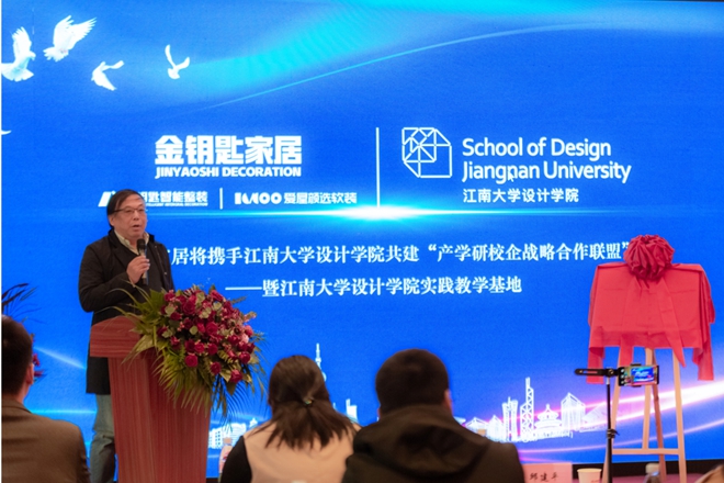 活动伊始,金钥匙家居公司董事长王镜先生致辞,他对企业及其业务进行介绍,表达了携手江南大学设计学院设立社会奖学金的喜悦之情。他表示,欢迎设计学院的同学们将金钥匙家居作为实践教学基地,开展设计实践。