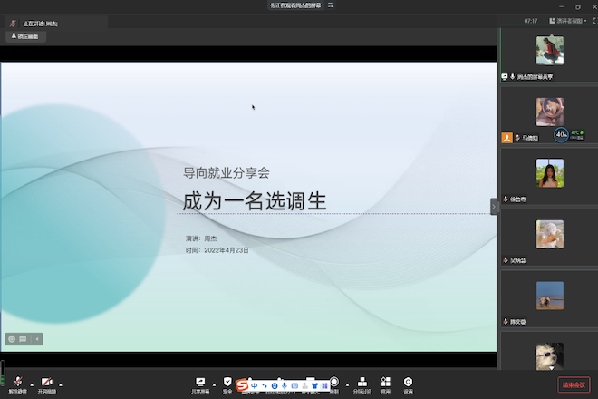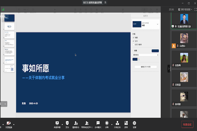 4月23日下午,设计学院成功举办2022年职业导航季首场活动“导向就业分享会”,作为设计学院特色项目,聚焦“选调生”“西部计划”“参军入伍”多项基层就业,邀请了成功“上岸”的学长学姐与同学们相聚“云端”,围绕考试准备、面试技巧、心路历程和自我收获等全方面多角度与大家交流分享。本次线上云分享会由设计学院辅导员马倩如主持,设计学院本硕共计300余位同学在线共同参与聆听。