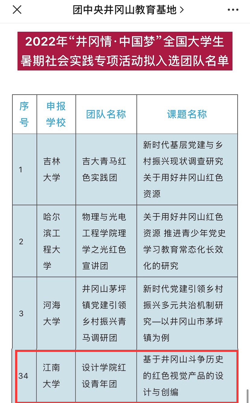 日前,团中央青年发展部、全国青少年井冈山革命传统教育基地管理中心公布2022“井冈情·中国梦”全国大学生暑期实践季专项行动入选团队名单,共有来自全国各高校的90支社会实践团队入选。江南大学设计学院“红设青年团”连续两年入选团中央社会实践专项。